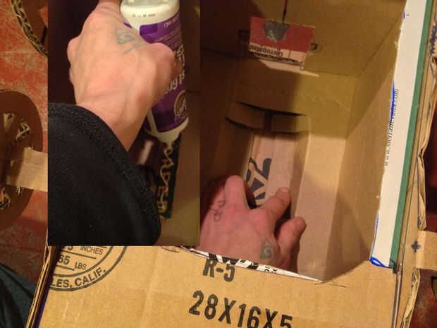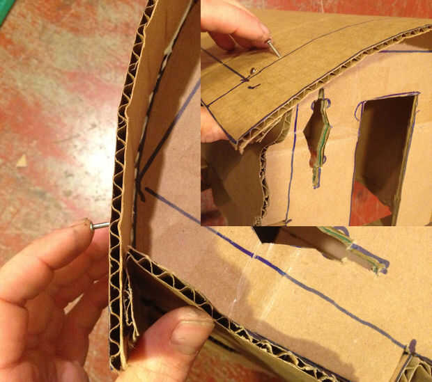 Para fijar el techo, pegamento a lo largo de la parte superior de los paneles delanteros y traseros y pegar los pliegues del alero de los paneles laterales. Sostiene en el alero, puede alinear las esquinas. Esta un poco abrazadera extra tiempo en mano al principio es a veces todo lo que es necesaria para mantener. Pero me gusta usar un par de caja de clavos en las esquinas de la pared. Estos se deslice fácilmente con el tiempo, pero si la uña pasa oblicuamente por los corrugaciones de la parte delantera y trasera, llevará a cabo admirablemente hasta que el pegamento se seca. Esto puede ser difícil golpear, pero lo que sea: un par meter marcas.