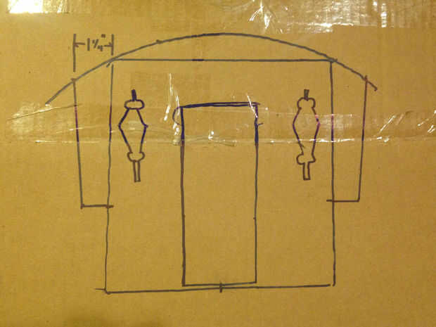 Es una curva demasiado grande para la mayoría de brújulas. Aquí puse el agujero de mi regla en el centro del umbral de la puerta y la sostuvo con un dedo. Con la otra mano encontrar la marca en la regla que afecta a la parte superior de la caja, manteniendo el lápiz se puede empujar la regla a través del arco--tal vez con una ronda de práctica puede realizar un satisfactorio de la curva. Alternativamente puede utilizar una cadena en lugar de la regla; por un dedo y envuelve una vez alrededor de su lápiz en la longitud correcta para golpear la esquina. No necesita ser tan precisa, y de hecho existe amplia variación en la forma de los techos de diferentes caravanas. Tener algún valor en la modificación del perfil frontal para lograr distinción y carácter en su casa de pronto-a-ser!