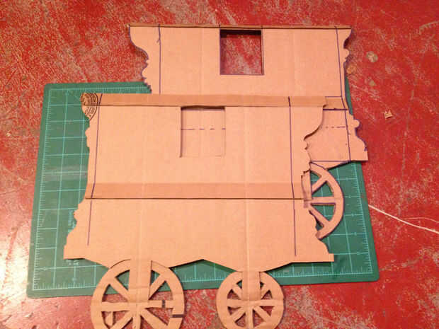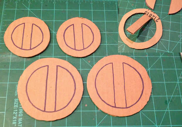 Si la rueda se dividen en cuartos y encontrar los puntos medios de los cuartos, puede hacer 8 radios bien espaciados. El rayo superior faltar porque el árbol está en su lugar, pero favorece tener una conexión carnosa agradable en lugar de hacer un eje cónico que se ajustan entre rayos. Hay probablemente un montón de maneras de ir sobre la configuración de las ruedas, pero esto me parece bastante claro y conserva mucho de la referencia de rueda de carro. No importa lo que hacemos aquí, se parece que usted está usando cartón en la cabeza.