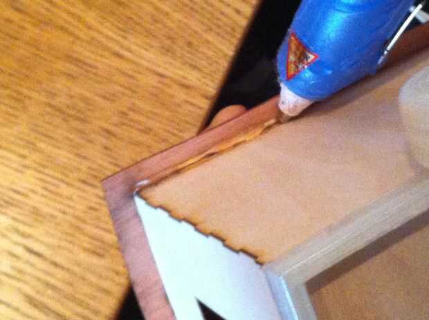 Si tenes mojado y doblada sobre un perno de balanceo, espere hasta que el techo quede seco. Coloque la cubierta sobre las lengüetas en la parte superior de las paredes. Aplique una tira de pegamento caliente en cada alero. Manténgala en posición mientras se enfría.