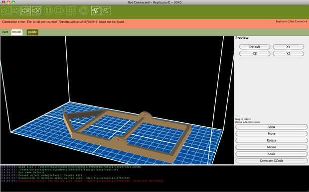 El primer paso es a 3D impresión el carro y las dos ruedas. Usted puede hacer esto en el TechShop si estás cerca de cualquiera de sus 7 localizaciones (http://techshop.ws/locations.html). He incluido en este paso los archivos de stl (estereolitografía) para el chasis (cart.stl) y las ruedas (wheel.stl) usted debe imprimir el archivo de rueda dos veces para tener dos. Si usted no ha tomado la clase de impresión 3D en Techshop, debe hacerlo antes de usar la impresora 3D. Usé replicatorG para obtener los archivos listos para imprimir.