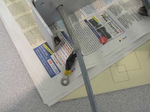 Ahora estaba feliz la toma sentaría a nivel y que era tiempo de cable, había estado pensando en cómo proteger el cable y llegó a través de un cable flexible forrado y se dio cuenta de que sería ideal no sólo donde el cable pasa thro los orificios del tubo donde usted normalmente pondría ojales pero si asegura la proyección a uno de los pasadores de montaje dejaría el cable se salgan con la toma de , así después de rociar el soporte con aerosol galvanizado frío que rosca el cable thro y reducir el aislamiento y prensado un anillo en la proyección (acero zincado) y protegida con algún termo retráctil. Desgraciadamente esto que grande para pasar por debajo de la caja de enchufe y preocupado de él partir, así que posteriormente de retirar el encogimiento del calor y aplastado abajo un poco para adaptarse; 0) he montado la caja y perforó un agujero para el cable-debo señalar la proyección no se utiliza como una correa de la tierra, el cable tiene un conductor de tierra , se utiliza para la protección mecánica y asegurar solamente, mientras se está conectado a tierra mediante el engarce para el soporte y luego el marco y el otro extremo está conectado a través de un cable de tierra, no es utilizado como una tierra