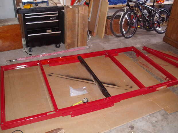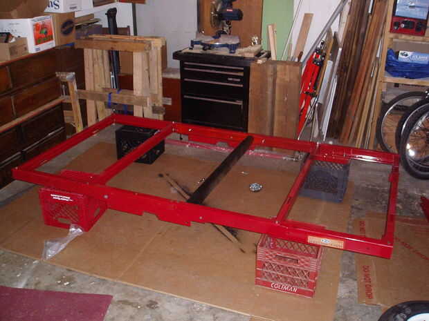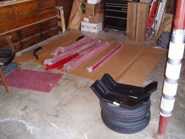 Me extendió un pedazo grande de cartón en el suelo de mi garaje y encajadas entre sí la cosa. Este trailer en particular está diseñada para doblar por la mitad. Los planes llaman para modificarlo así que tiene un cuerpo sólido. Esto consiste en hacer un mástil adicional de madera para poner en el centro (lo pinté negro).