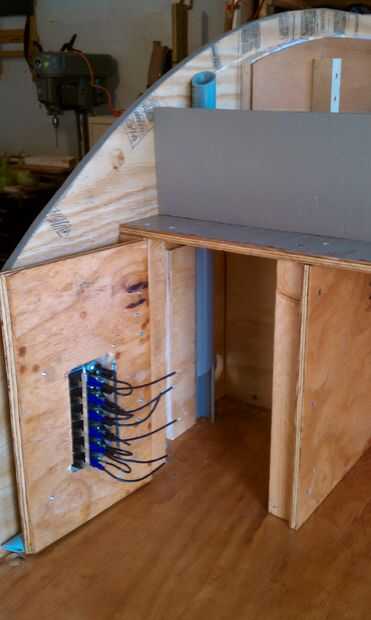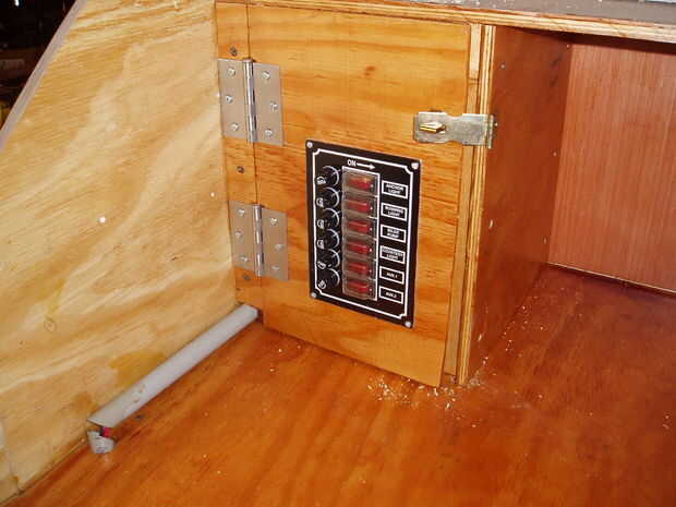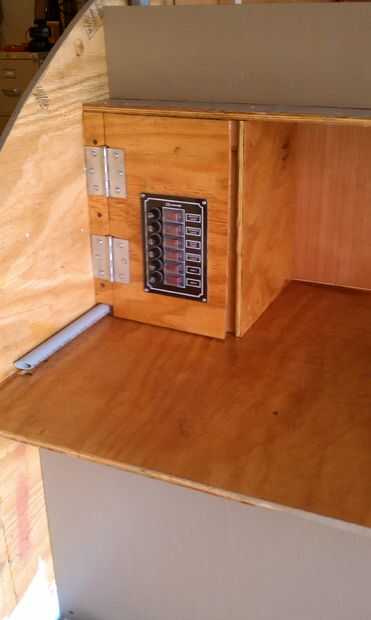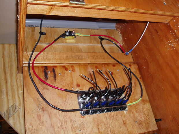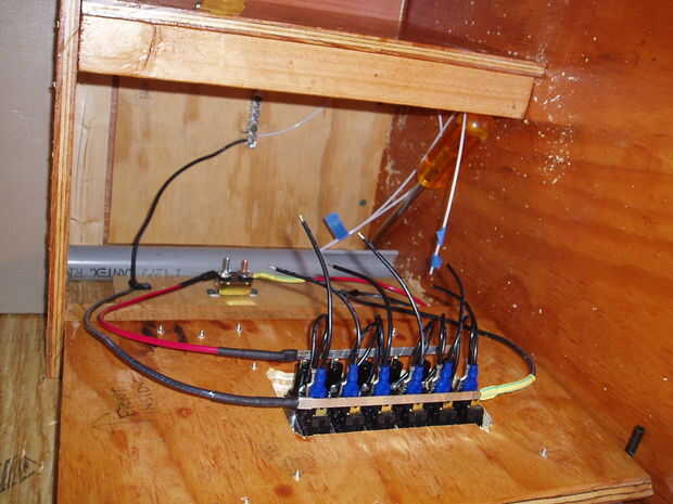 Opté por una zona de dormitorio ya que no pude poner la caja eléctrica debajo de la cubierta. Así que construí una caja encima de la encimera y a los lados. Me encontré un trozo de conducto hasta el interior de la pared para coger los cables que pasan por el techo. Había usado calibre 12 para los tomacorrientes de 12 voltios y calibre 16 para todo lo demás. He utilizado un panel de fusibles que tengo de Bass Pro. Ha significado para los barcos pero trabajó muy bien para mis propósitos.