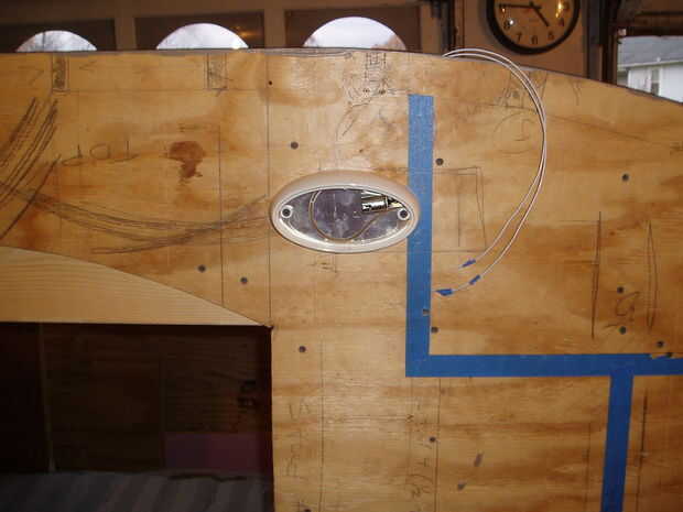 a ambos lados del remolque he añadido una luz exterior junto a la puerta.  Me quedaba un canal dentro del sandwich pared para ejecutar ese cableado.