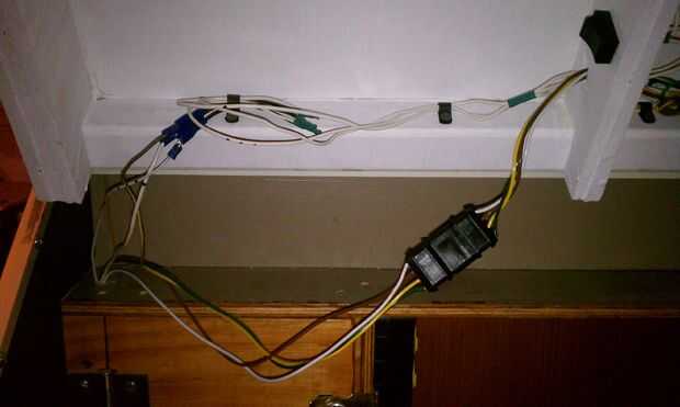 Deliberadamente mantenía las luces remolque completamente separada. Corren de un enchufe en el vehículo remolcador como cualquier remolque. En este caso es un conector de cuatro terminales. Los cables se envían bajo el remolque. Entonces ellos serpentean a lo largo de la parte interior del costado del conductor a través de y la parte superior de mi cuadro eléctrico. He añadido una conexión adicional en la escotilla para que simplemente pude desconectar en lugar de tener que cortar cables si es necesario quitar la tapa.