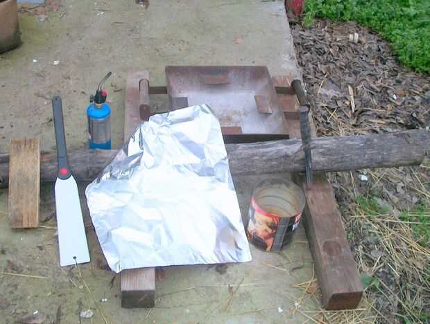 Un cuchillo de combate Ka-bar para partir la madera, cuña acero y trineo o un froe también funcionaría. (esto es parte de una fragua edificio aventura así que puedo hacer un froe fuera una vieja hoja de cortacésped)
