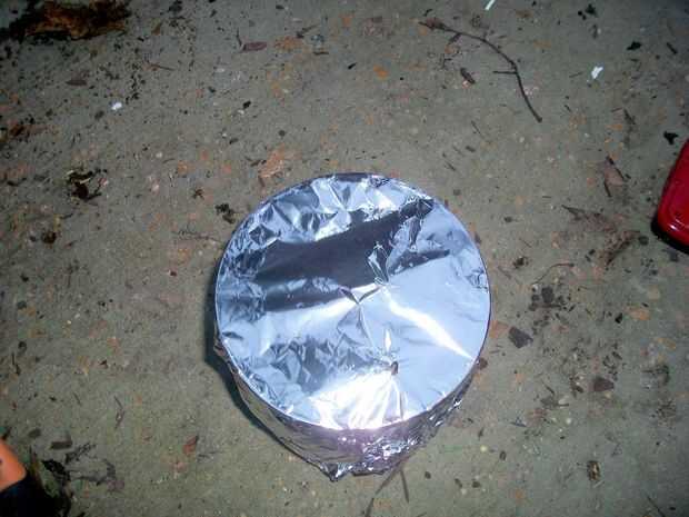 Entonces llené la lata tanto como pudo y cubierto con papel de aluminio. Pongo un pequeño agujero en el papel de aluminio para permitir la humedad y finalmente madera gas, escapar.