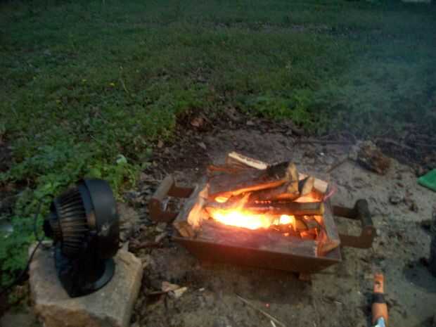 Después de encender el fuego y apilado en el roble, el fuego se miraba lento, fabricación de carbón de leña tradicional requiere paciencia, pero quería esta hecha esta noche! así que poner un ventilador en el fuego, el sealed-ish hacer carbón de leña puede pasó una media hora más tarde y que conduce al siguiente paso.