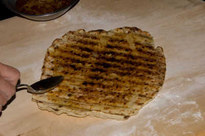 Fino de la cuchara y difundir, con la parte posterior de una cuchara, aceite de oliva (o infundida preferentemente aceite de oliva, mencionado anteriormente) a la parrilla del lado de la masa (foto).