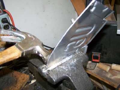 Estoy usando mi mordaza de freno de chapa.  La parte superior de las quijadas siga la línea de puntos a 105 grados de paso 5.  Aprovechado a lo largo de su longitud poco a poco con un martillo para obtener una curva agradable.