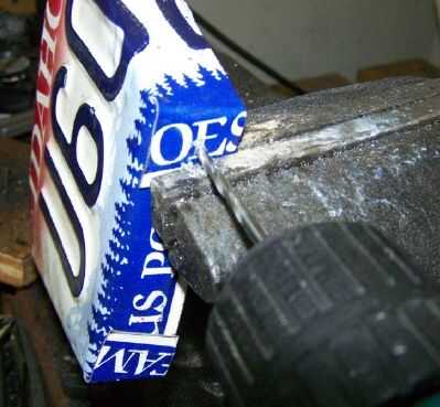 Sujete la parte posterior de la pala cerca de una esquina en la prensa.  Taladro para un remache pop, pero Revise para estar seguro el agujero atraviesa tanto la ficha desde el lado y la pieza de la parte posterior de la cuchara.  Estoy usando remaches pop de 1/8 x 1/8 pulgadas de aluminio.  Hacer el remachado en cada agujero medida que taladra.  Aunque es opcional, en este proyecto me gusta colocar la cabeza del remache pop en una superficie de metal duro y libra el otro extremo relativamente plana.  Hace que el remache más plano y debe agregar algo de fuerza.