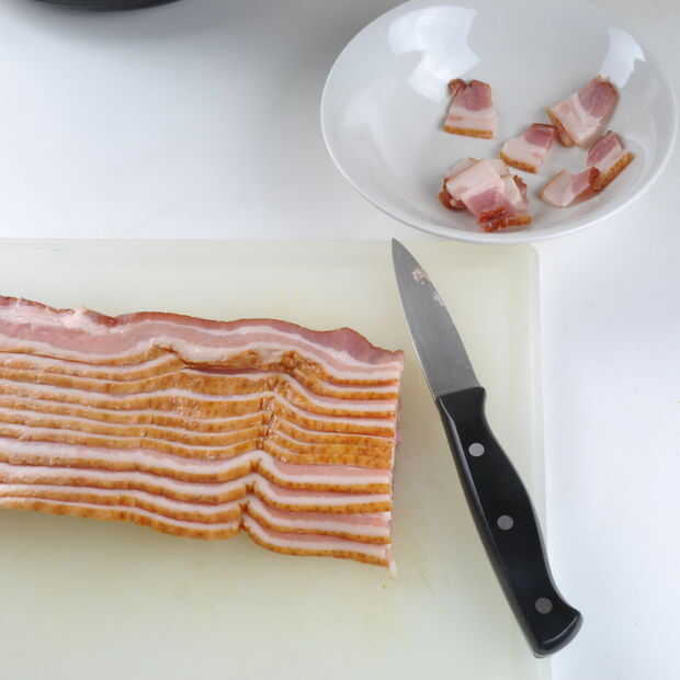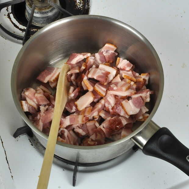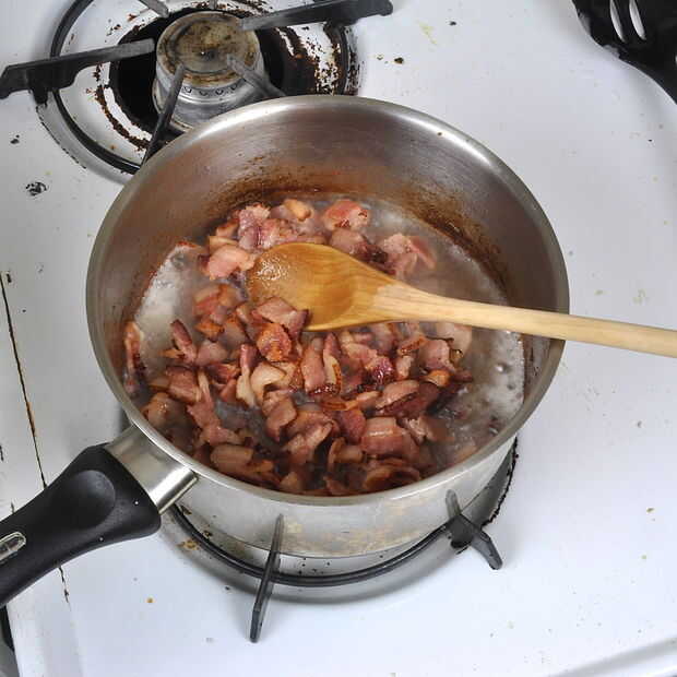 • Mientras se cocina el tocino, empezar a calentar algo de agua.  (Puede hacerlo antes de empezar el tocino).