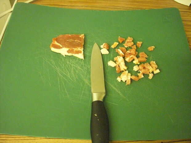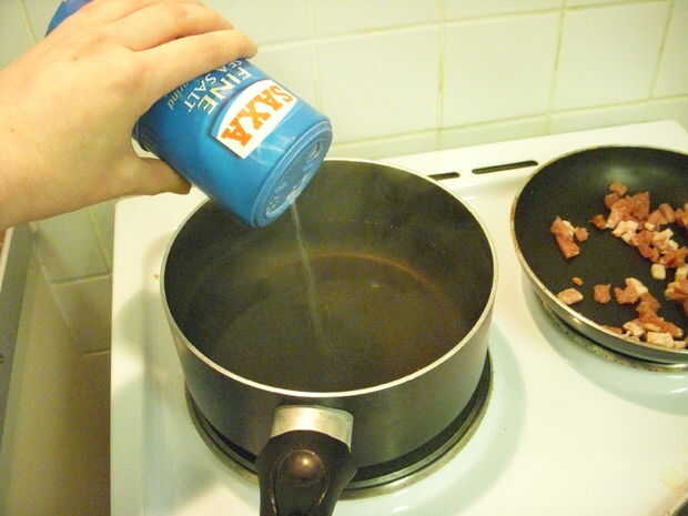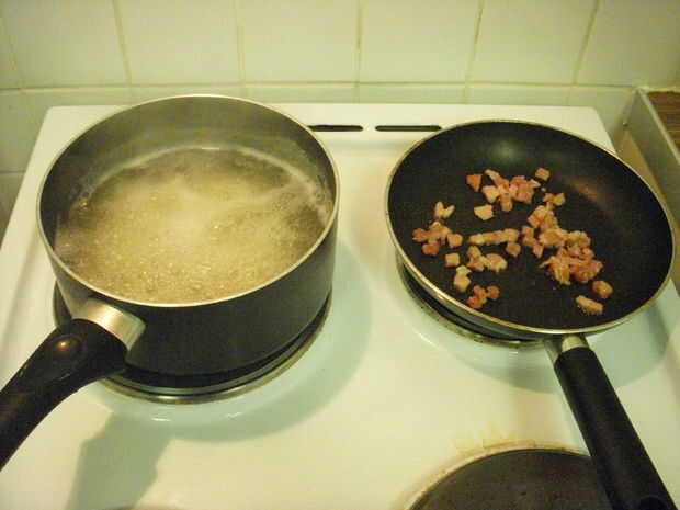 esto es una simple pero deliciosa receta Carbonara que utiliza sólo cuatro ingredientes: espaguetis, queso, un huevo y una rebanada de tocino. (Supuestamente, el nombre "a la carbonara" es una referencia a los mineros del carbón en Italia que co