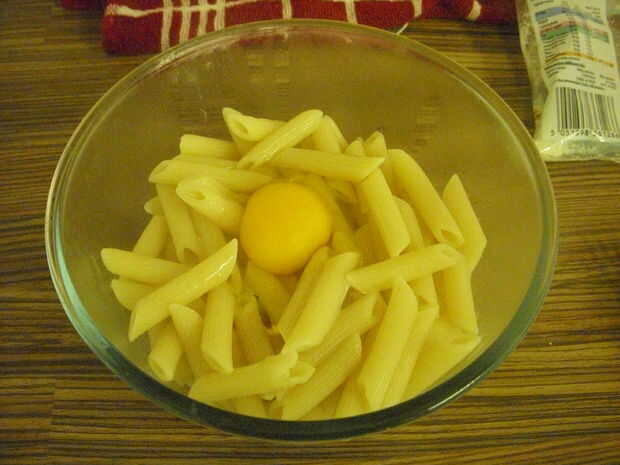 Tan pronto como la pasta está en el tazón de fuente, romper su huevo en él. Así es, directamente en la pasta. Luego mezclarlo! Quiere el huevo distribuido lo más uniformemente posible, ya que si lo dejas sentarse se cuaje. Seguir revolviendo hasta que se mezclan el huevo, la mantequilla y el queso y la salsa empiece a espesar.