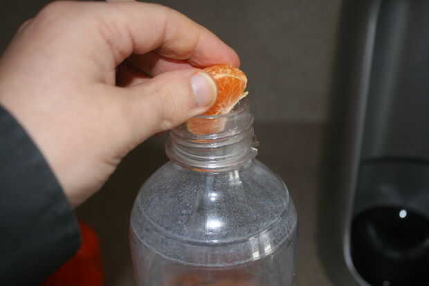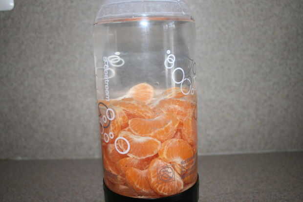 Llena la botella hasta la línea recomendada en la secuencia de soda y entonces agregan fruta, verter el agua para mantenerla en la línea de llenado como las naranjas lo desplazaron. No llevar seguimiento de cuántos he añadido, pero era muy poco. Digamos que entraron tangelos todo siete u ocho, que libremente llena la botella de agua a mitad de camino.