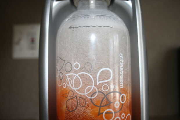 Hubo muchas más burbujas y hormigueantes en la botella que lo normal. Por lo general el agua fizzes para arriba como el CO2 lo está cargando, pero luego se disipa al instante una vez que se suelta el botón. Tomó varios segundo para se disipe con las rodajas de naranja en. Esto debería haber sido una señal de advertencia para mí para el siguiente paso...