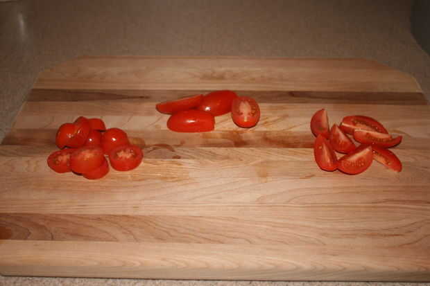 Algunos tomates fueron cortados en cuartos, mientras que otros fueron cortados en mitades simple. Un tercer conjunto de dos fue cortado en discos pequeños. No hice ningún esfuerzo especial para quitar las semillas, pero el más pequeño cortarlas, las semillas más perdieron.