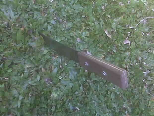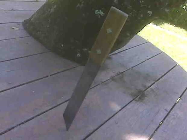 Hice el disco utilizando una placa de acero al carbono que compré en una tienda de acero. Corte a la forma, suavizar partes ásperas, desigual, con una amoladora de ángulo, poner un borde en acero, y calor tratar el acero en mi Fragua de carbón. Su muy resistente, durable y difícil de romper. La punta, en particular, es muy resistente y duradero porque pasé mucho tiempo en tratamiento de calor. El mango estaba hecho de madera de teca, atornillado entre sí.