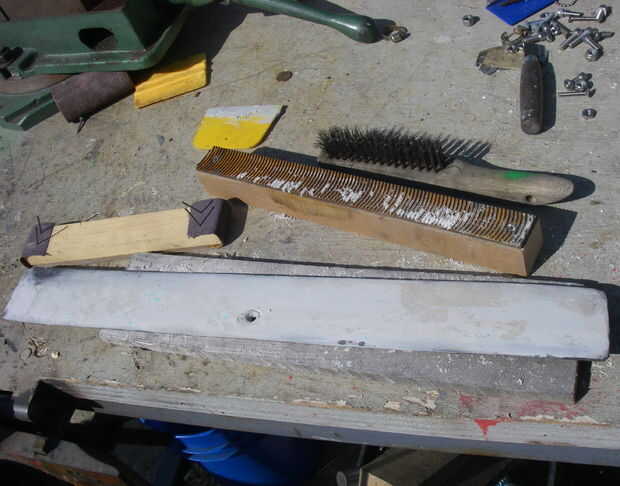 Me hizo el trabajo áspero eso Escofina de bondo. Usé el cepillo de alambre para limpiar los dientes de la escofina. Cuando el bondo era duro bastante cambié al bloque de lijado, luego papel de lija de granos más finos de la mano.