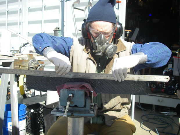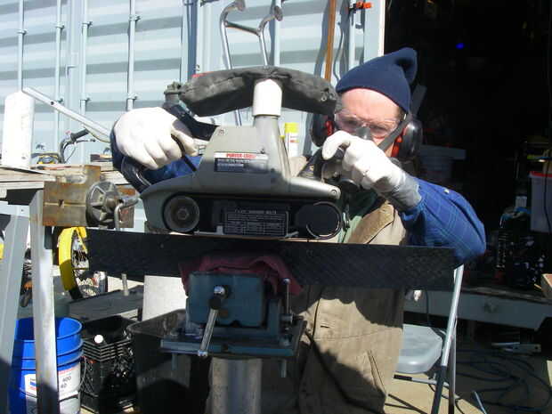 Esta lijadora de banda cuenta con un sistema de recolección de polvo, pero todavía da inicio a un montón de fibras hacia la parte posterior. He conseguido más inteligente, ahora estoy usando guantes con cinta de conducto para mi camisa de manga larga.