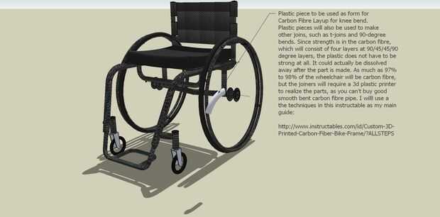 Piezas de plástico se utilizan como formas para Layup de fibra de carbono para la rodilla se dobla en la producción de fuerte peso extremadamente ligero de fibra de carbono marco de la silla de ruedas y se utilizará también para hacer otras combinaciones, como t-uniones y curvas de 90 grados. Puesto que la resistencia es la fibra de carbono, que consistirá en hasta ocho capas en capas de 90/45 /-45/0/45 /-45/90 grado, además de una o dos capas de seda de 90 grados de acabado o acabado satinado de la armadura, el plástico no tiene que ser fuerte en todo. Que podría realmente ser disuelto lejos después de que la pieza se hace, pero no se disuelve el plástico, ya que considero que es un procedimiento innecesario y bastante tóxico. Tanto como del 97 al 98% de la silla de ruedas será de fibra de carbono, incluyendo llantas, ejes y bordes de la mano, pero los carpinteros requieren una impresora 3d de plástico realizar las piezas, como se puede comprar el tubo de fibra de carbono doblada lisa buena, y la realización de la estructura completa sería, creo, ser irrealizable sin una impresora 3d de plástico. Se utilizo las técnicas en este instructable como mi principal guía: