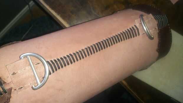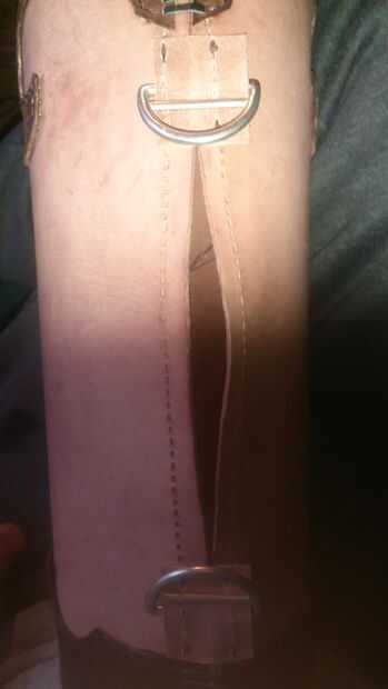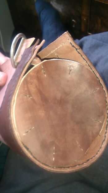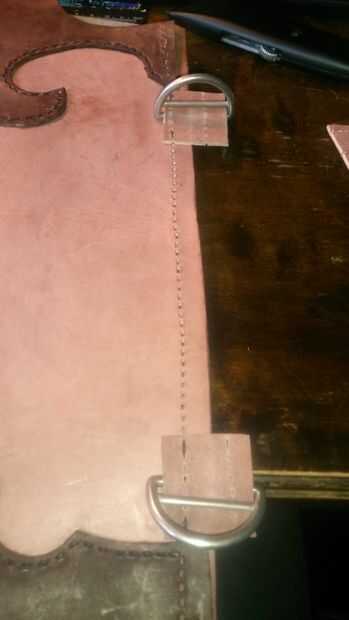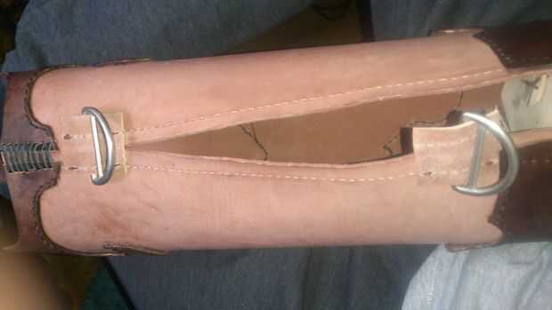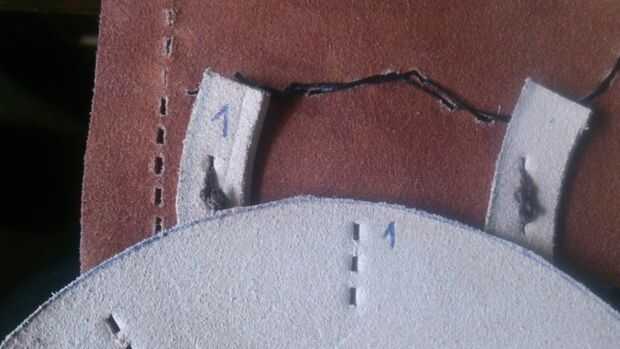 Tiempo para empezar a hacer este pedazo de cuero en un carcaj. Primero conecté la parte pequeña justo encima de la parte inferior (debajo del soporte de correa inferior) (no usar cualquier pegamento para esta parte), y después de que coser la parte inferior en su lugar.