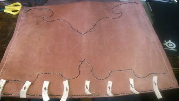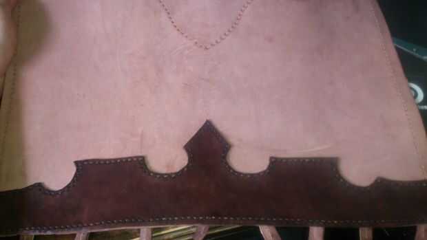 Siguiente es las partes superior e inferior (no la inferior pero la decoración de la parte inferior). Primero aplique el pegamento en la parte posterior de la piel, pero no a cerca de los bordes el pegamento puede untar en el cuerpo principal y fijar la piel con pinzas. No voy a intentar explicar la técnica de costura, puedes encontrar un montón de guías sobre cómo coser costuras en cuero. Pero básicamente fui dos adelante (en la parte trasera) y uno hacia atrás (en la parte frontal). Tal vez se pueden ver los patrones en las imágenes.