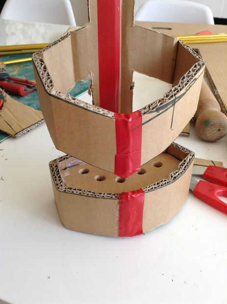 En este punto, añadir las bodegas que se sientan en la aljaba de apoyo adicional de las flechas. Utilice la parte inferior de la aljaba para las secciones pequeñas del rastro. Se necesita uno para la media sección (o parte superior o sea su más alto apoyo) y en la parte inferior, poner dos, pero les de espacio para utilizar el más bajo como base. Luego usa las flechas para empujar los agujeros en los dos soportes superiores. Asegúrese de hacer los agujeros lo suficientemente amplio como para cada flecha caber en a, pero pequeño suficiente para que las flechas no se mueven demasiado. No poner los agujeros en la parte inferior; se trata de la base.