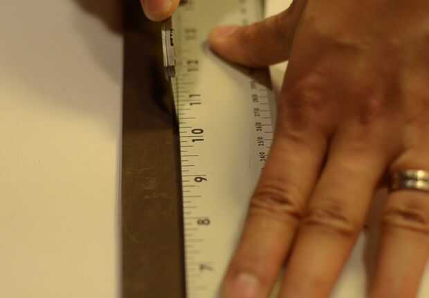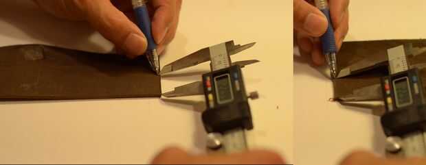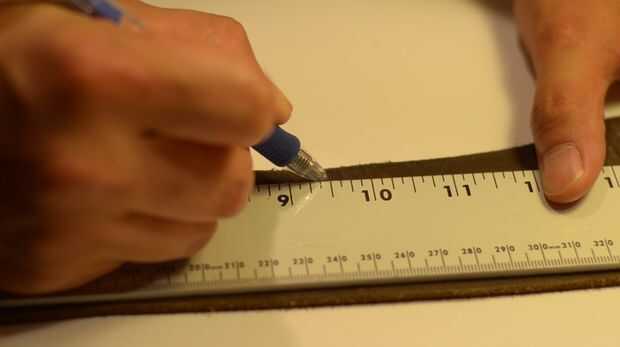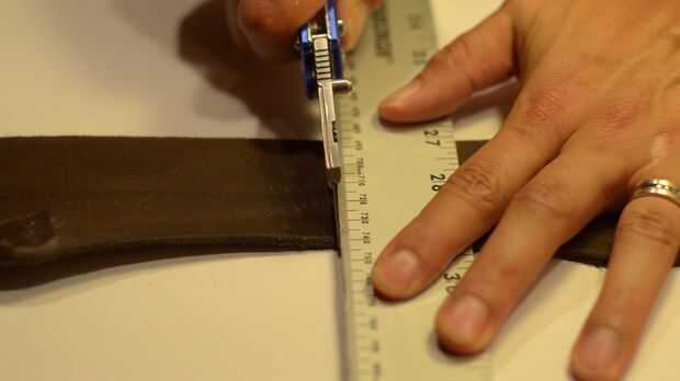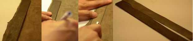 Es mejor insertar una nueva hoja en tu cuchillo para llegar limpio, cortes rectos. Empezar haciendo un rectángulo de 10 "x 1" de la pieza más gruesa del cuero*. Al cortar el rectángulo, coloque encima de la pieza más fina de cuero y trazar con un lápiz o un marcador. Corte la forma simplemente localizar y colocar encima la pieza gruesa para ver si coinciden en anchura. Si no, no te preocupes, puedes recortar cada pieza más adelante cuando has pegado juntos.