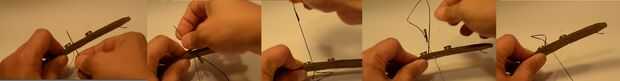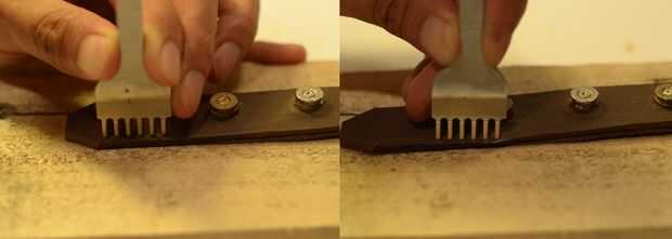 Como dice el paso, esto es opcional, pero hace la banda mucho mejor. Perfora orificios de costuras con el cincel de cuero en el borde. No tengo un ranurador del borde, así que tuve que lo eyeball. Una Ranuradora de borde se utiliza normalmente para hacer un surco uniforme a lo largo del borde de un pedazo de cuero donde la sutura es capaz de sentarse debajo de la superficie de la piel. Utilicé un hilo de nylon encerado negro y había cosido una puntada corriente a lo largo del perímetro de la banda. Cuando llegué al último agujero, he atado un nudo y usa un encendedor para derretir los extremos juntos. Asegúrese de hacerlo en el lado que va a estar en contra de la muñeca.