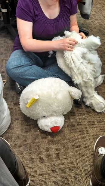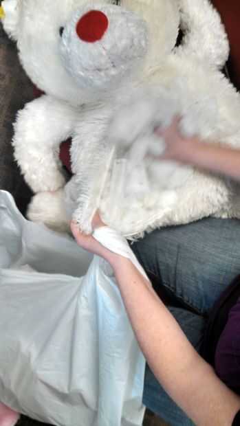 6. coser la cabeza y los pies en el cuerpo del oso que está en el molde