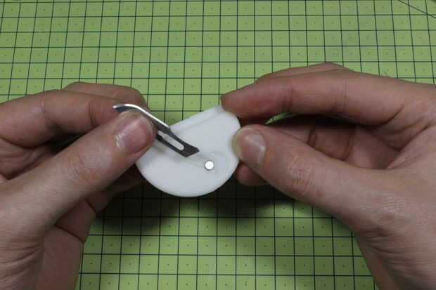 3. (todavía holding cuchilla en su lugar), listo con el imán. Inserte en el agujero.