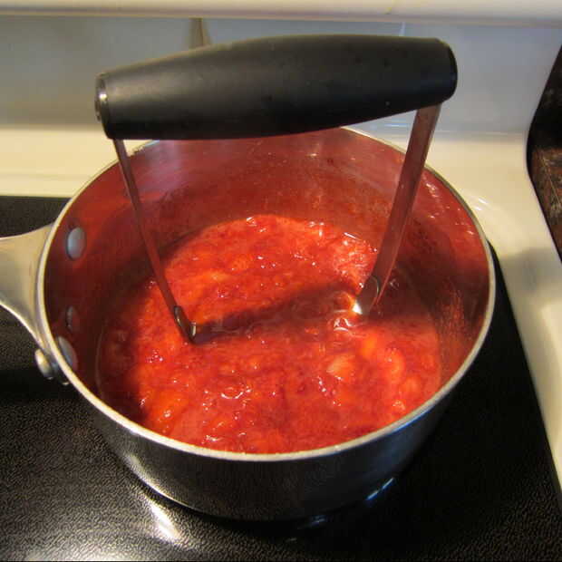 Puré de sobre encimera - en una cacerola mediana a fuego medio cocine 2 libras de fruta fresca hasta que suelte jugos/azúcares y fruta es suave y blanda. Remover del calor. Puré con una trituradora de la patata hasta que esté suave. No será tan suave como con el uso de la licuadora pero funcionará. Dejar reposar hasta que se necesite.