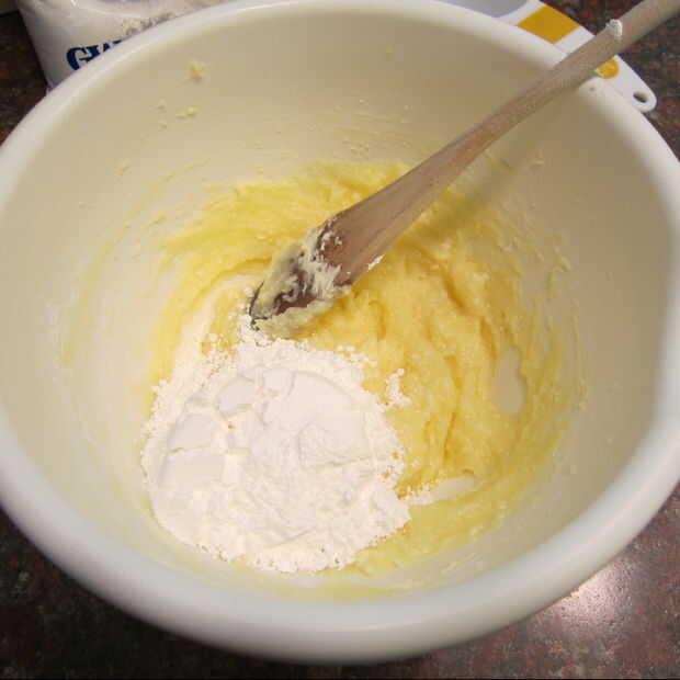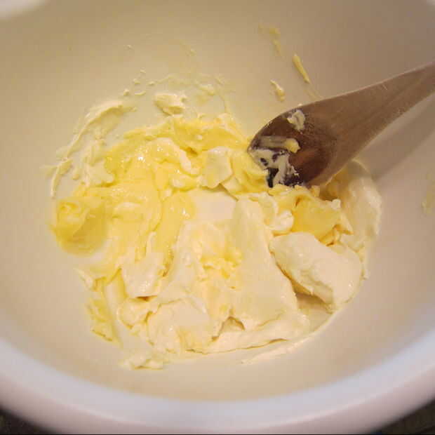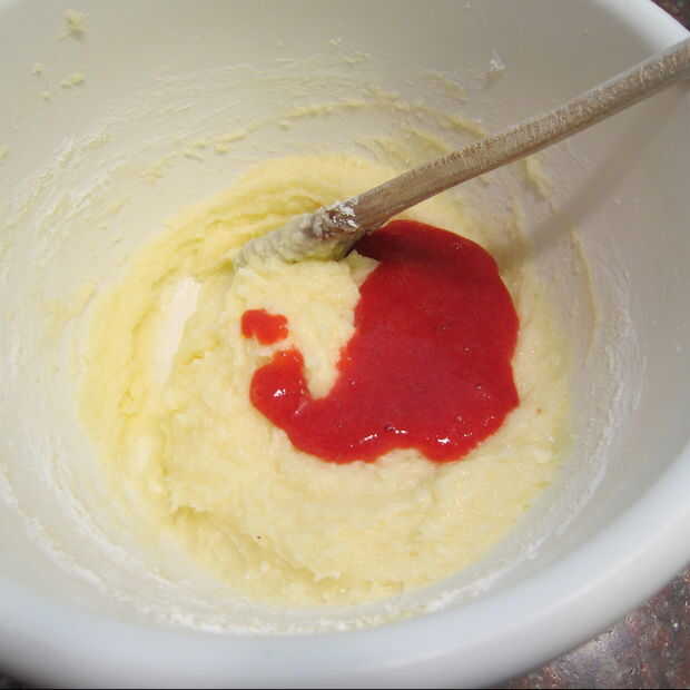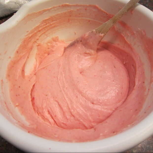 En un tazón mediano mezclar la manteca y crema de queso bien. Agregar el puré de fresas y revolver. Agregar azúcar en polvo (1/2 taza por vez) hasta que la mezcla es lo suficientemente gruesa como para mantener su forma.