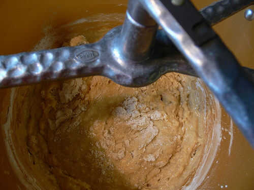 5. seguir añadiendo harina hasta tieso pero todavía bastante pegajoso.