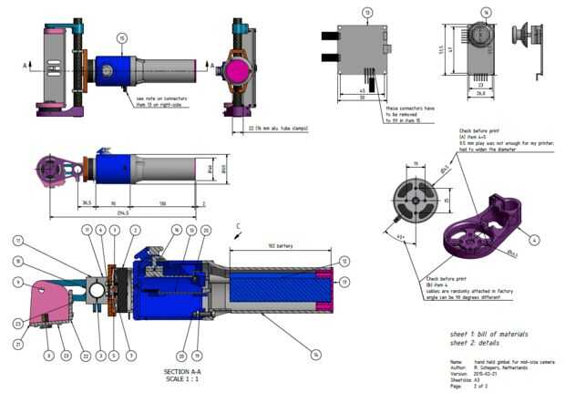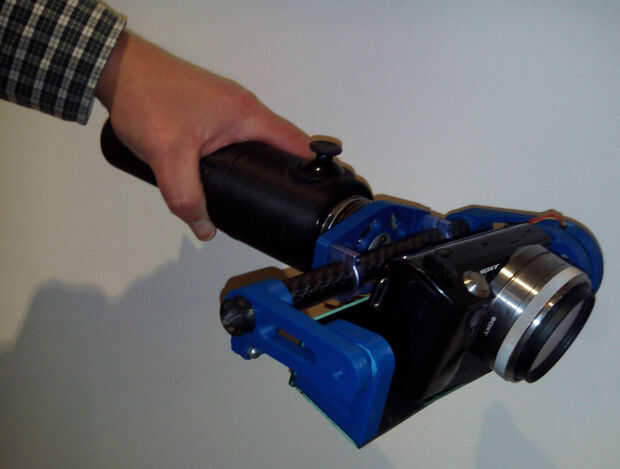 Se trata de un cardán de 2 ejes simple que utiliza dos motores sin escobillas y un controlador de simpleBGC de AlexMos con palanca de mando separado. El cardán estabiliza roll y pitch del movimiento, por lo que la cámara permanece nivel. Precio para las piezas de compra es de unos $100 total.