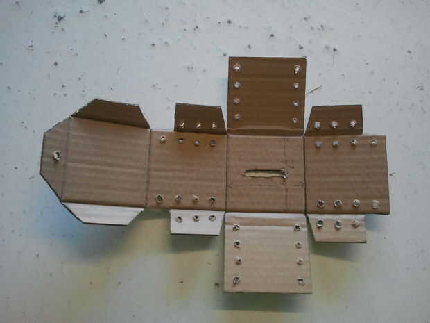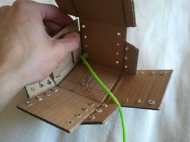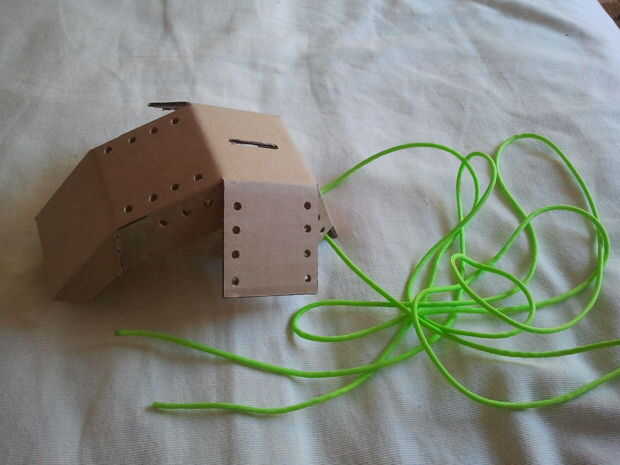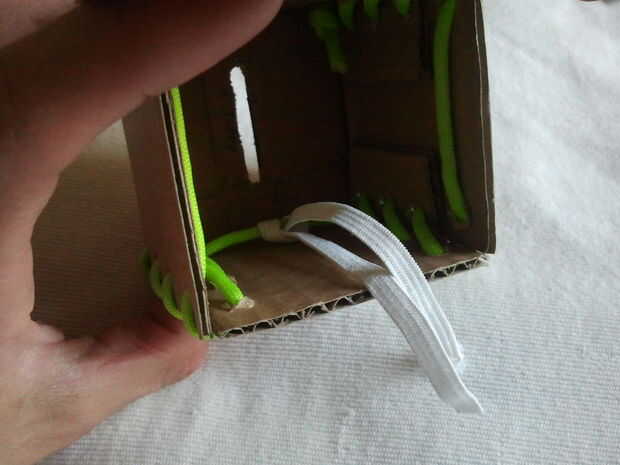 Los pasos para hacer esta hucha están fáciles: dibujar la forma en la cartulina, cortarla, hacer los agujeros y montar la caja con el cable. La última cosa a hacer es cerrar la "tapa" con la banda de goma o cinta elástica.