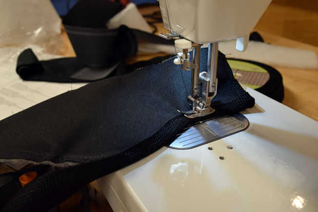 4) una vez que todo ha sido cosido en sus respectivas capas, utilice la cinta para crear un ajuste en el exterior, doblando por la mitad a lo largo del borde y coser a lo largo del perímetro. DESDE los extremos de la cinta antes de coser para impedir que siga cayendo a pedazos.