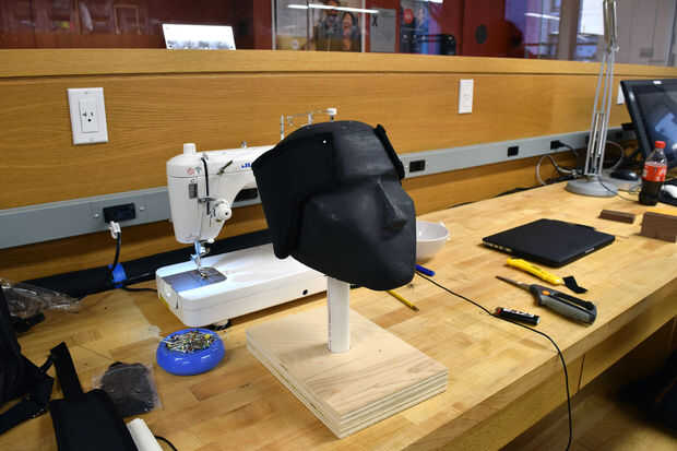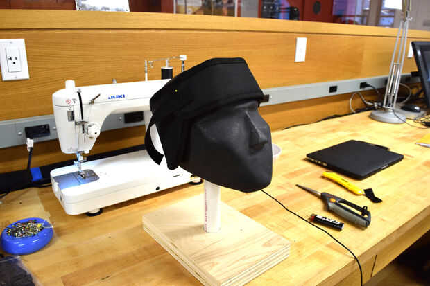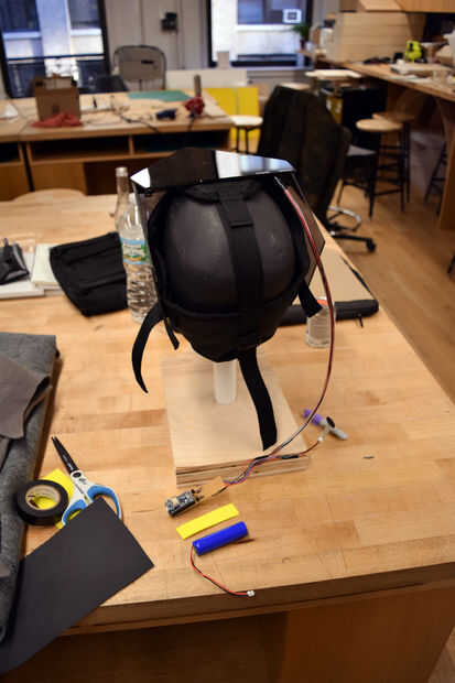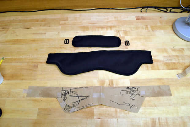 5) después de que terminé, me di cuenta de que necesita más apoyo para sostener el visor, así que tomé algún material de desecho y las correas y hecho una correa de la parte superior de la cabeza