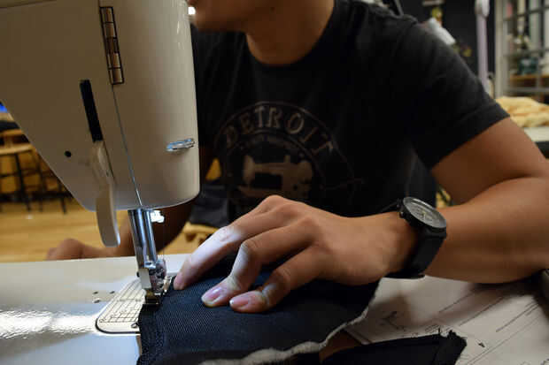 2) después de cortar los patrones, trazar y cortar los patrones en cada uno de sus tres materiales (al aire libre de la lona, bateo).