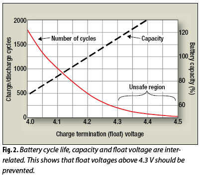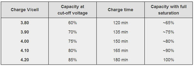 Mayoría de las baterías de iones de litio se cargan a 4.2v por celda, voltajes más altos podrían aumentar la capacidad, pero reducir la vida de servicio. Y más bajas pueden aumentar los ciclos de carga de batería a costa de menos tiempo de ejecución. (Véase el gráfico tercero)