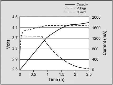 Etapa CC. Se trata de la etapa todos los cargadores de usan y la única para los cargadores más rápidos. En la fase actual constante, la batería básicamente está conectada a una fuente de alimentación de corriente limitado, limitada generalmente a 0.5-0.7 veces la capacidad nominal de la batería (que es de 0,5 a 0,7 C) dura hasta que el voltaje de la célula llega a 4.2v. Al final de esta etapa, la carga de la batería es aproximadamente 70-80%.