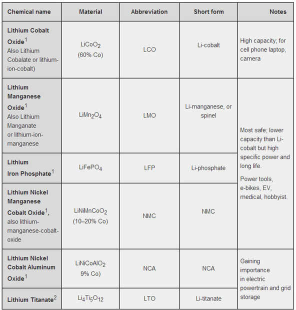 Hay un montón de diferentes tipos de baterías de litio basado, pero sólo son diferentes en los materiales utilizados y la arquitectura. Los científicos prefieren baterías de nombre por su nombre químico y el material utilizado, y a menos que seas un químico, estos términos pueden confundirse. La tabla anterior ofrece claridad enumerando estas baterías por su nombre completo, definición química, abreviaturas y forma corta.