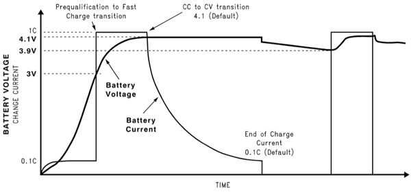Carga de relleno. Dependiendo del cargador y de la autodescarga de la batería, una carga de relleno se puede implementar una vez cada 500 horas o 20 días. Típicamente, la carga entra en acción cuando el voltaje terminal abierto cae a 4.05V celular y da vuelta apagado al llegar a 4.20V / celular otra vez.