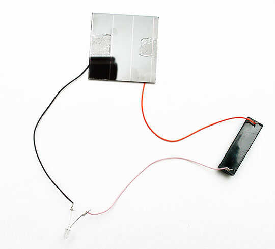 Conecte el terminal rojo positivo del panel solar a la pata negativa del soporte de la batería. Utilice el alambre extra suministrado para conectar el extremo positivo del soporte de la batería a más de las dos patas del LED. La etapa más larga de un LED está conectada siempre con el lado positivo del circuito. Luego conecte el cable negativo del panel solar a la otra pata del LED. Si la batería está completamente cargada y tienes un día soleado el LED deberá encenderse. Incluso puede alimentar el panel solar de una potente antorcha o lámpara brillando sobre el panel. Trate de experimentar por tratar de encender el LED con la batería solo, o con el panel solar solo.