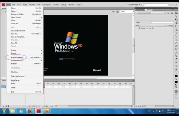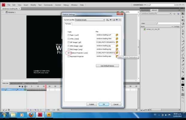 Para guardar el flash como un .exe sólo tienes que ir al menú Archivo, configuración de publicación. Allí, marque la casilla de proyector (.exe) de windows, en el icono de carpeta elija donde guardar el archivo. Y finalmente, pulse publicar antes de pulsar ok.