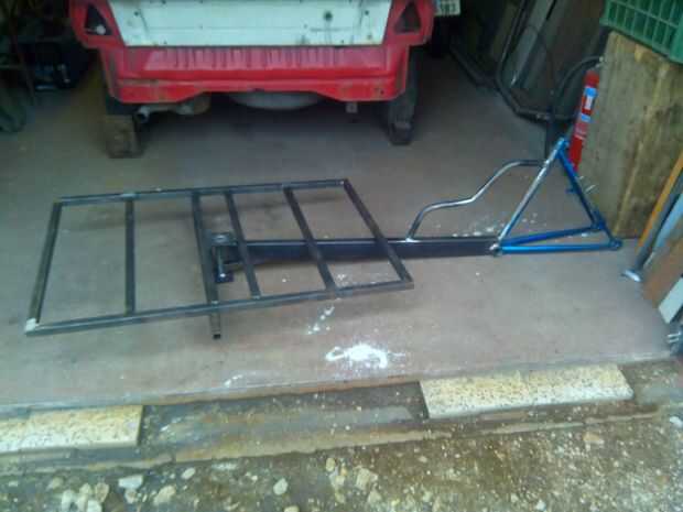 sí, no sé soldar, pero sí sé cómo chapuza!  Este trailer te llevará menos de 30 minutos y menos de $10 en partes si usted puede conseguir un remolque usado que alguien está tirando hacia fuera.  (Probar craigslist o freecycle.com para la gente del vi