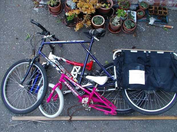 Coloque varias bicis y las piezas en relación con una línea de tierra (representado por el palo) y reflexionar sobre las posibilidades. Trato de una variedad de daños bicicletas forma la pila de chatarra, en busca de los que tienen las características y dimensiones que quiera.