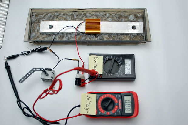 Aquí es una unidad de Seebeck incorrecta (gritos) encender un motor. La unidad termoeléctrica genera energía eléctrica como calor pasa a través del fuego al hielo agua. La unidad tiene una capa delgada de grasa térmica para ayudar a la conductividad. Se sienta en una barra de aluminio en el agua helada mantiene al otro lado a 32F, así que tuvimos una línea de base. La parte superior del elemento termoeléctrico está cubierta con el metal a proteger se quemen. Resulta que realmente no necesitamos.